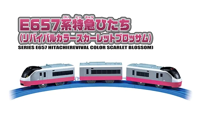 フレッシュひたちリバイバルカラーの特別塗装を施したE657系特急ひたちからリバイバルカラースカーレットブロッサムがプラレールに登場!