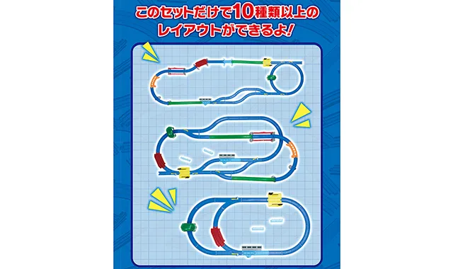 オリジナル新車両や新パーツも入って、10種類以上のレイアウトが作れる大ボリュームなセットです。