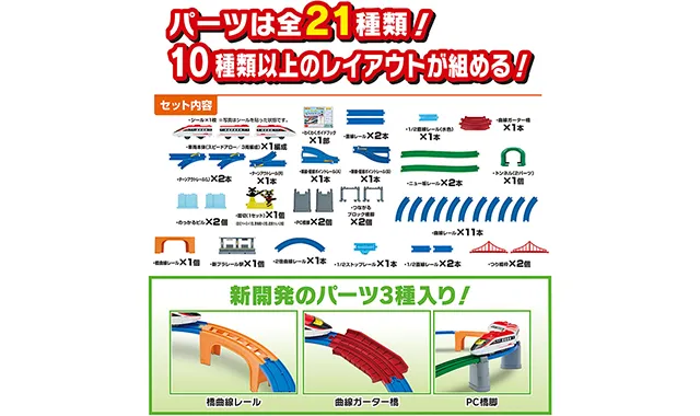 パーツは全21種類!このセットだけで、10種類以上のレイアウトを組むことができる大ボリュームな商品です。