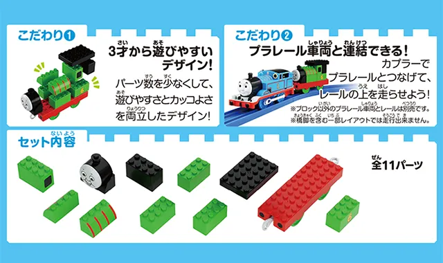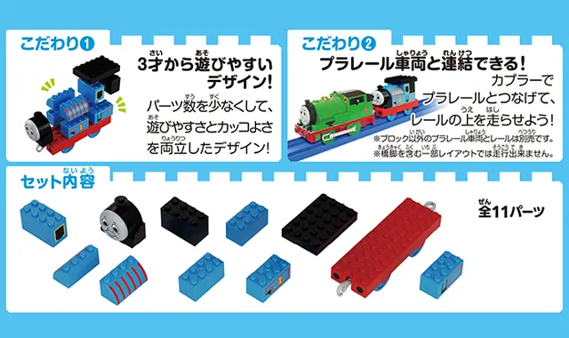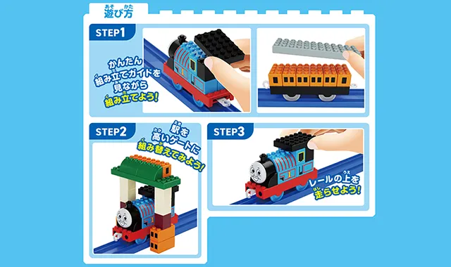 全37パーツのブロックを使って、『きかんしゃトーマス』のなかまたちををキミの手で組み立てよう!