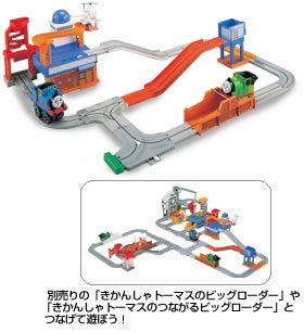 きかんしゃトーマスとパーシー、ハロルドが石炭をつむ、はこぶ、いれる、おろすなど9つの動きをくり返すよ!