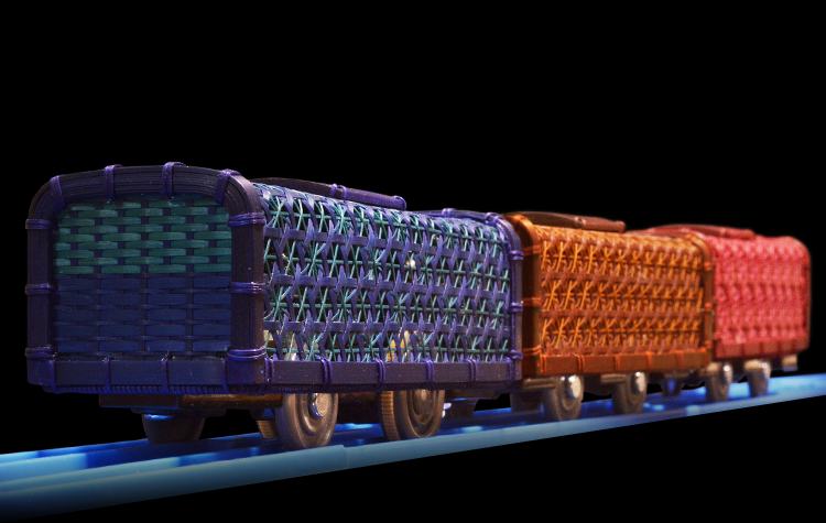アクセサリーを作る中で結構小さいものには挑戦してきたのですが、やはり小さなプラレール車両の中に編み目の美しさを見せていこうとすると、更に細い材料で編まなければならなくなり、その材料作りが結構大変でした。また、電車の形としてスマートに仕上げていくところは、籠とは違ってきますので、新しい技法に挑戦することになり、とても難しかったです。