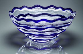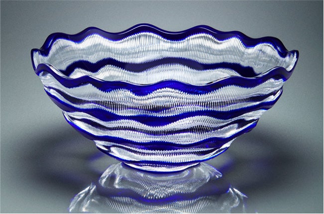 どうしても僕らは普段作業していると、器のほぼほぼ100%に模様を入れたがるんですね。間が空いてるとその間が怖いっていうと変ですけど、バランスよく間を残すっていうのがなかなかできなくて。今回、入れにくいというか作業しにくいというところが、結果的に空間として残ってる訳なんですけれども、その間がちょうどいい感じに残ったのかなと思って。今回そういう意味では、この品物は上手くいったのかなっていう気はします。日本画とか焼き物なんかですと、その絵付けの器ってびっしり入っているものもありますけど、やっぱり適当に間がある、その間の美しさっていうのがあると思うので、今回は夜空っていうかこのブルーが印象的で、全部カットしてしまったんでは、この綺麗なブルーがなくなってしまうので、このブルーを残しつつ柄を入れる、柄を見せるっていうので、今回のデザインは自分でも気に入っています。