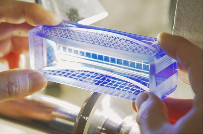 正直、僕が心配したのは、まずこのサイズのガラスがうまく出来るのか、ということ。この点は、猿江ガラスさんが苦労して吹き上げてくれました。次に出来上がったガラスにどんな模様が入れられるのかっていうのを考えました。縦横比もちょっと特殊ですし、入った時に収まりのいい形、デザインっていうのも当然あるでしょうし、どうしても電車っていうイメージが頭の中にあるんで。リアルに電車っぽく模様を彫るっていうのも、上手く収まる気がしなかったので、今回は、イメージでこんな柄が入ったらいいんじゃないかなっていうので上手く収まってくれたので、よかったなとは思います。