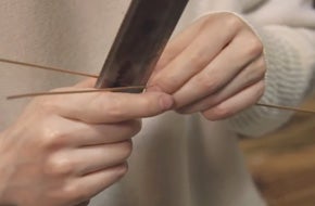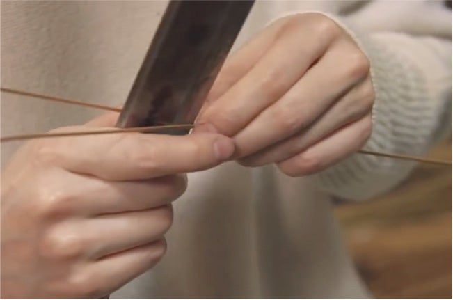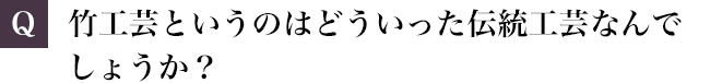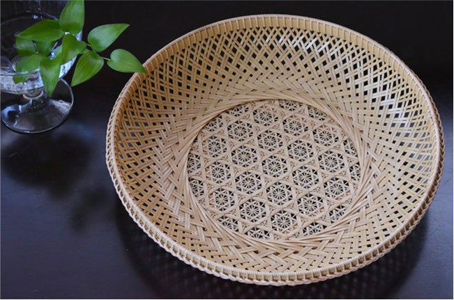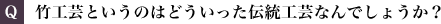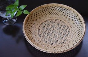 竹工芸は竹を割って、または筒のまま用いて、素材の表情を活かしながら器物を作る工芸です。その中でも私のやっているのは、竹ひごを作り、それを編んで籠などの細工物にする編組加工と呼ばれる分野です。元々は農具や漁具などの実用品を作る技術として伝わってきたものですが、室町時代以降、茶道や華道において竹工芸品が用いられるようになり、美術的な価値が見出されるようになりました。花籠や、湯を沸かす炭を入れるための炭斗などがそれです。今では様々なテーブルウェアや照明器具なども作られています。