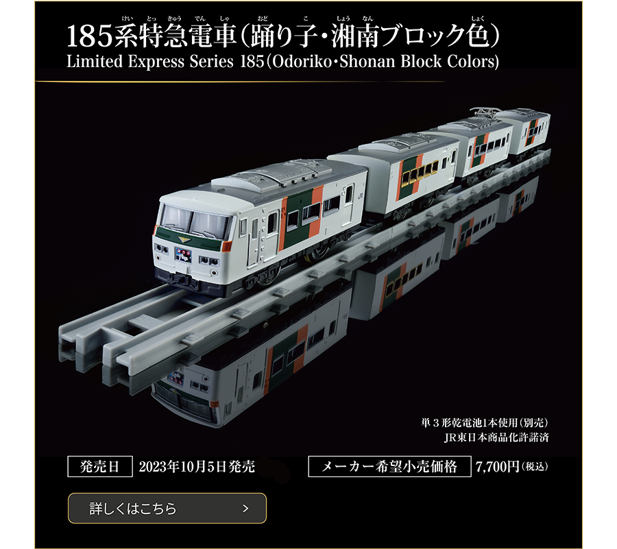 185系特急電車(踊り子・湘南ブロック色)|Limited Express Series 185(Odoriko・Shonan Block Colors)|発売日:2023年10月5日発売予定|メーカー希望小売価格:7,700円(税込)|単3形乾電池1本使用(別売)|JR東日本商品化許諾済