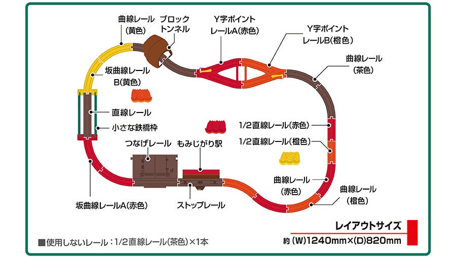 レイアウトサイズ約(W)1,240mm×(D)820mm|▪️使用しないレール:1/2直線レール(茶色)×1本