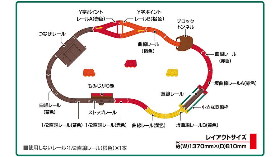 レイアウトサイズ約(W)1,370mm×(D)810mm|▪️使用しないレール:1/2直線レール(茶色)×1本