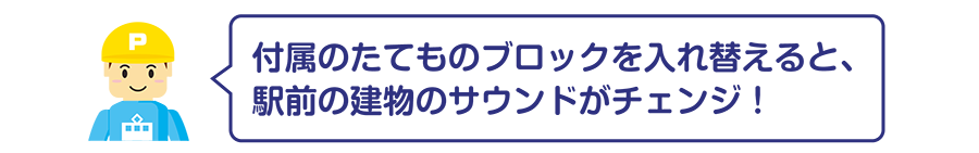 付属のたてものブロックを入れ替えると、駅前の建物のサウンドがチェンジ!