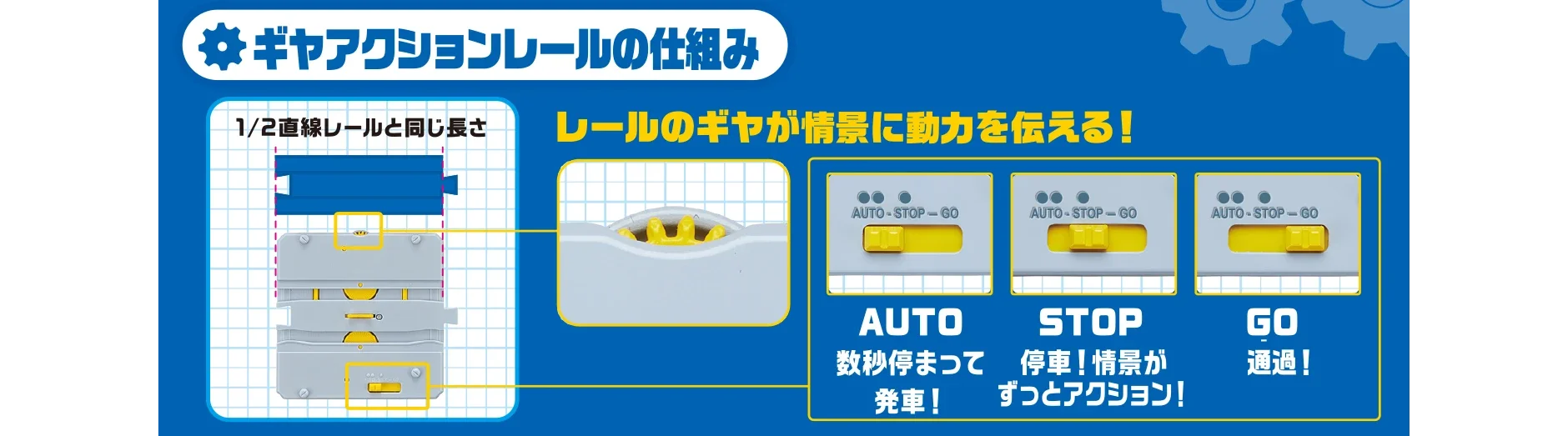 ギヤアクションレールの仕組み|レールのギヤが情景に動力を伝える!|1/2直線レールと同じ長さ| 「AUTO」数秒停まって発車!「STOP」停車!情景がずっとアクション!「GO」通過!