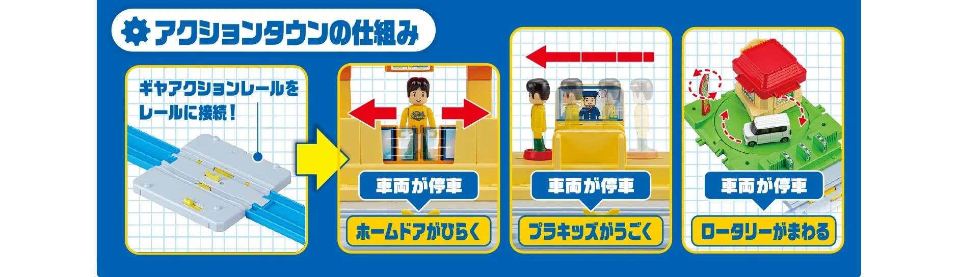 アクションタウンの仕組み|ギアアクションレールをレールに接続!→「車両が停車→ホームドアがひらく」「車両が停車→プラキッズがうごく」「車両が停車→ロータリーがまわる」