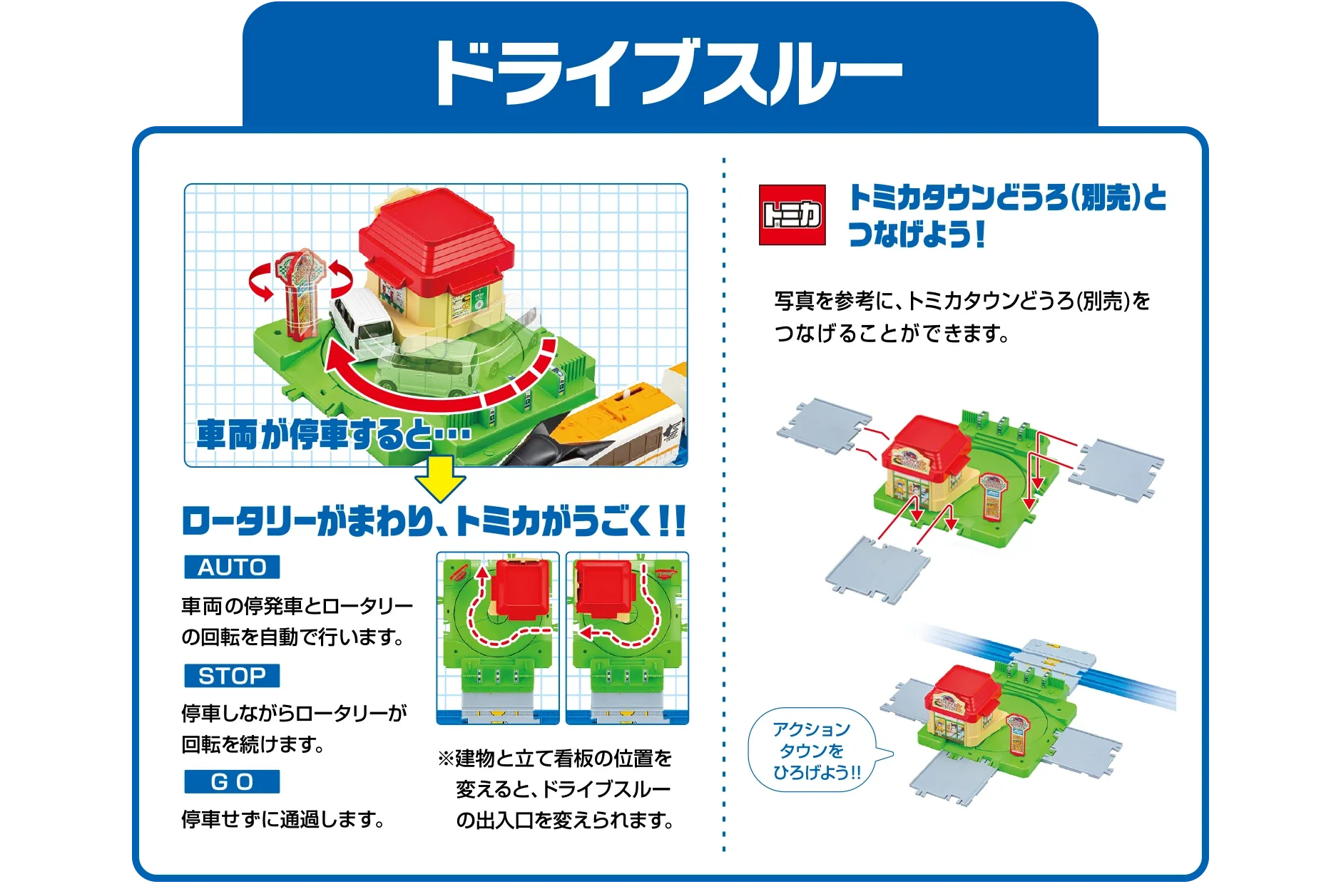 『ドライブスルー』車両が停車すると…→ロータリーがまわり、トミカがうごく!! 「AUTO」車両の停発車とロータリーの回転を自動で行います。「STOP」停車しながらロータリーが回転を続けます。「GO」停車せずに通過します。|※建物と立て看板の位置を変えると、ドライブスルーの出入口を変えられます。|トミカタウンどうろ(別売)とつなげよう!…写真を参考に、トミカタウンどうろ(別売)をつなげることができます。