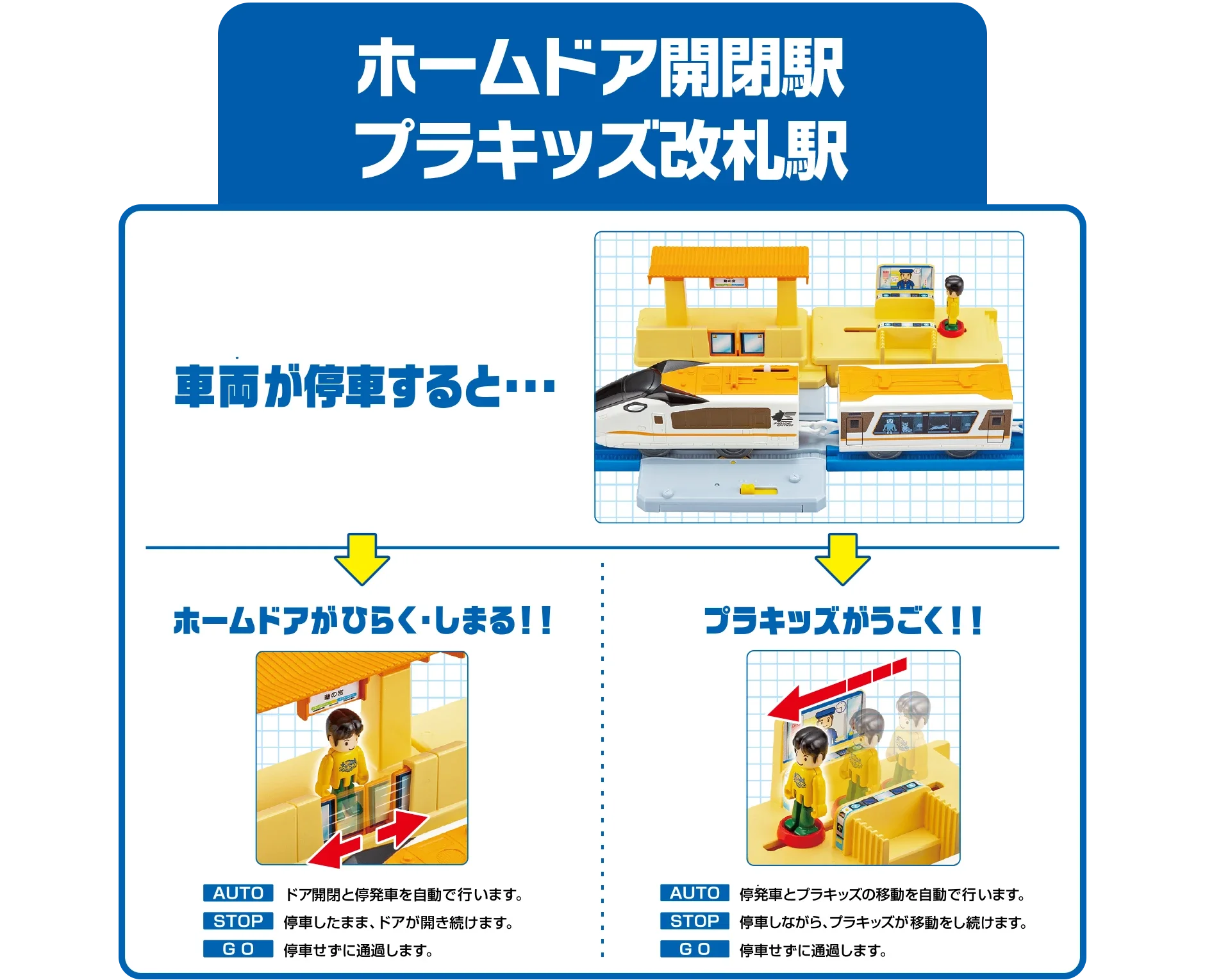 『ホームドア開閉駅』車両が停車すると…→ホームドアがひらく・しまる!! 「AUTO」ドア開閉と停発車を自動で行います。「STOP」停車したまま、ドアが開き続けます。「GO」停車せずに通過します。|『プラキッズ改札駅』車両が停車すると…→プラキッズがうごく!! 「AUTO」停発車とプラキッズの移動を自動で行います。「STOP」停車しながら、プラキッズが移動をし続けます。「GO」停車せずに通過します。