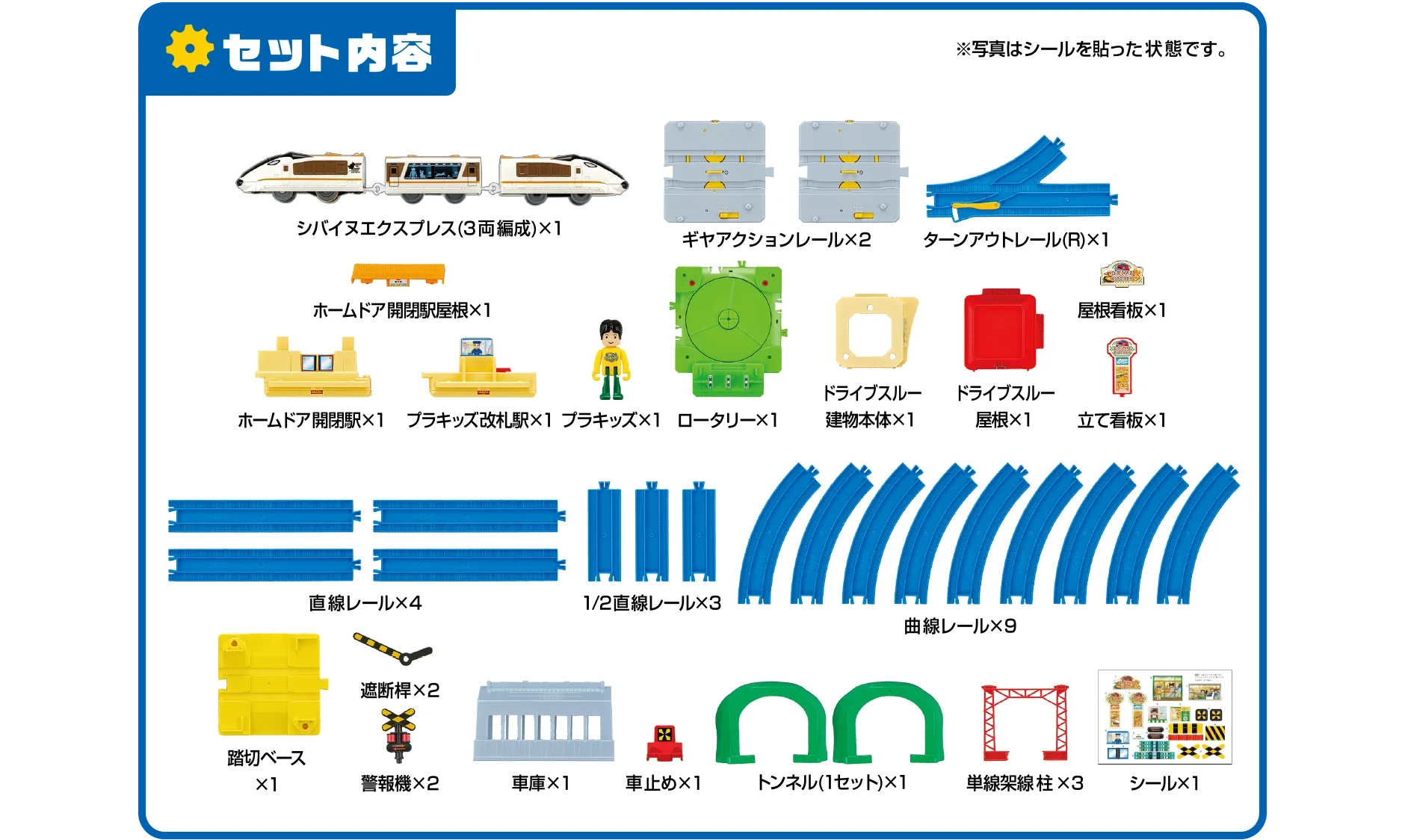 セット内容|シバイヌエクスプレス(3両編成)×1|ギアアクションレール×2|ターンアウトレール(R)×1|ホームドア開閉駅屋根×1|ホームドア開閉駅×1|プラキッズ改札駅×1|プラキッズ×1|ロータリー×1|ドライブスルー建物本体×1|ドライブスルー屋根×1|屋根看板×1|立て看板×1|直線レール×4|1/2直線レール×3|曲線レール×9|踏切ベース×1|遮断桿×2|警報機×2|車庫×1|車止め×1|トンネル(1セット)×1|単線架線柱×3|シール×1|※写真はシールを貼った状態です。