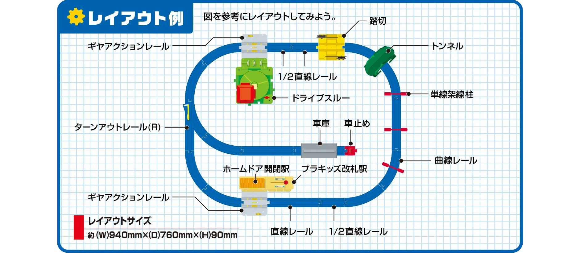 レイアウト例|図を参考にレイアウトしてみよう。|レイアウトサイズ:約(W)940mm×(D)760mm×(H)90mm