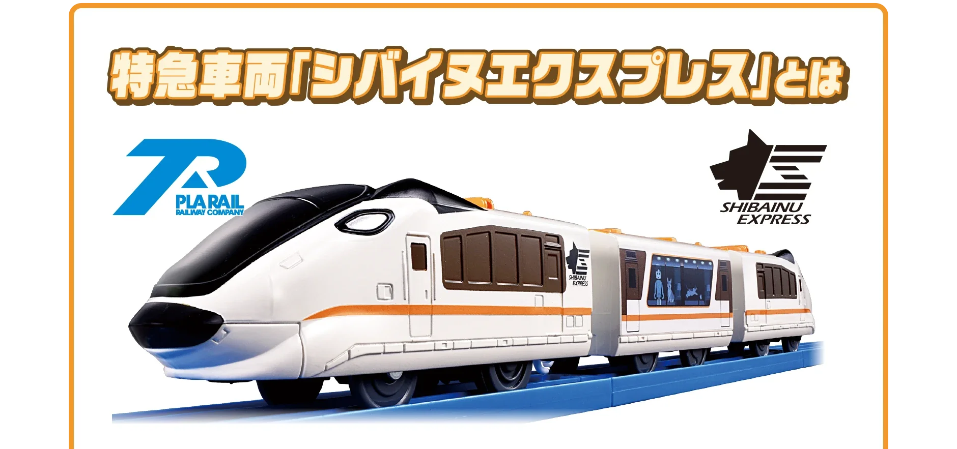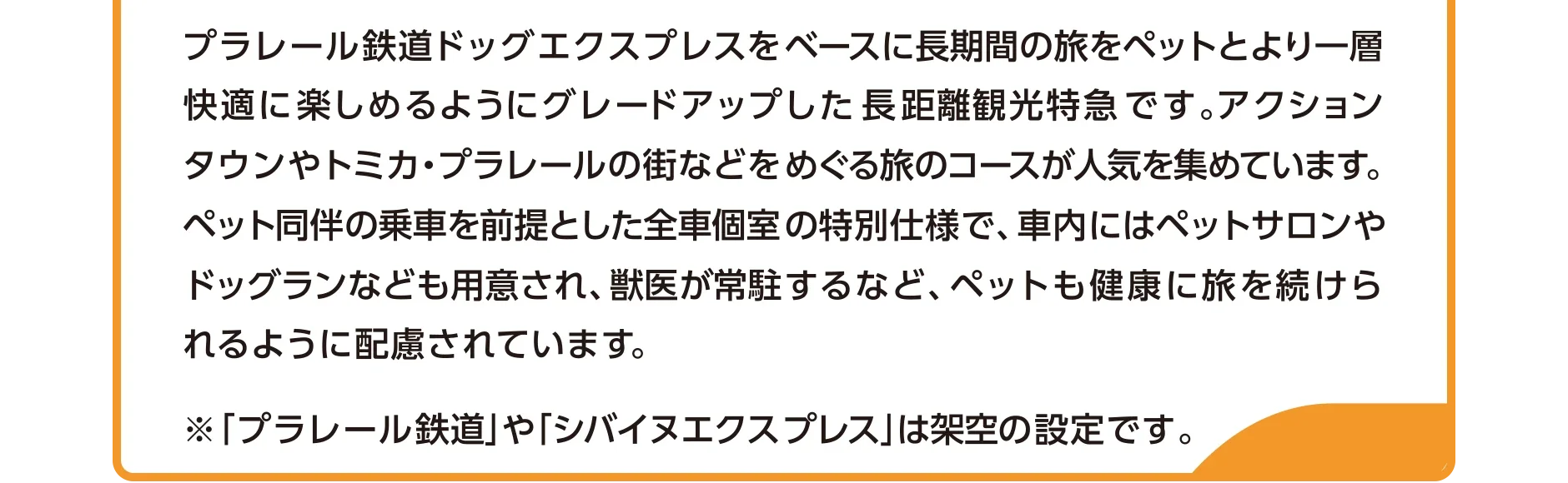 プラレール鉄道ドッグエクスプレスをベースに長期間の旅をペットとより一層快適に楽しめるようにグレードアップした長距離観光特急です。アクションタウンやトミカ・プラレールの街などをめぐる旅のコースが人気を集めています。ペット同伴の乗車を前提とした全車個室の特別仕様で、車内にはペットサロンやドッグランなども用意され、獣医が常駐するなど、ペットも健康に旅を続けられるように配慮されています。|※「プラレール鉄道」や「シバイヌエクスプレス」は架空の設定です。