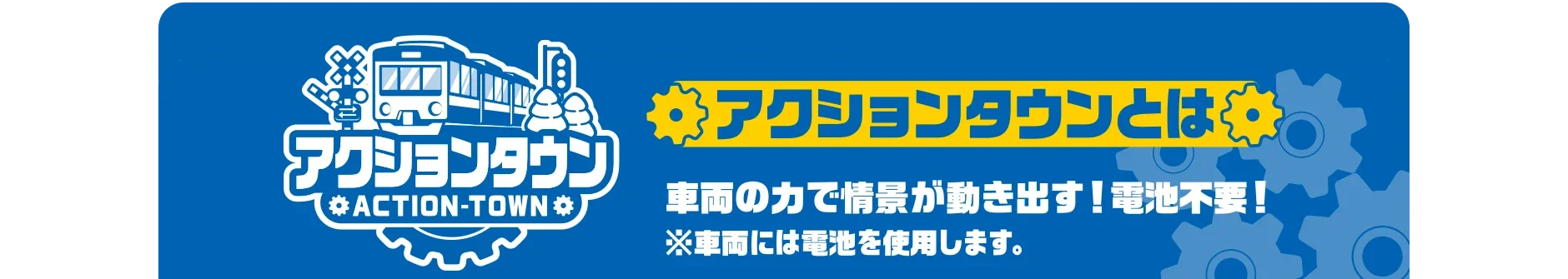 アクションタウンとは|車両の力で情景が動き出す!電池不要!|※車両には電池を使用します。