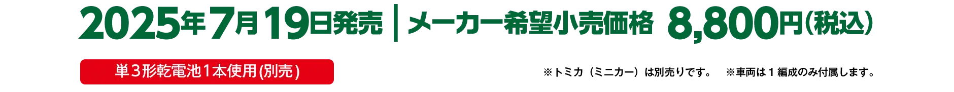 2025年7月19日発売|メーカー希望小売価格 8,800円(税込)|単3乾電池1本使用(別売)|※トミカ(ミニカー)は別売です。※車両は1編成のみ付属します。