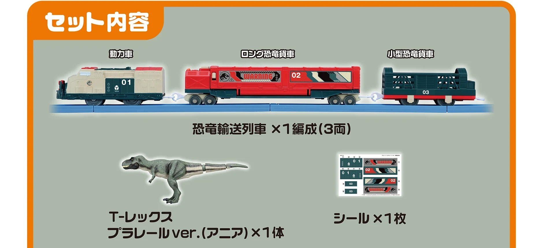 セット内容|恐竜輸送列車「動力車」「ロング恐竜貨車」「小型恐竜貨車」×1編成(3両)|T-レックス プラレールVer.(アニア)×1体|シール×1枚