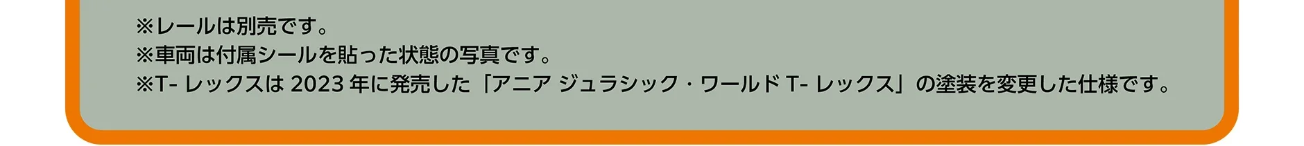 ※レールは別売です。※車両は付属シールを貼った状態の写真です。※T-レックスは2023年に発売した「アニア ジュラシック・ワールド T-レックス」の塗装を変更した仕様です。