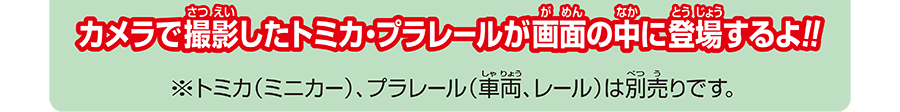 カメラで撮影したトミカ・プラレールが画面の中に登場するよ!!|※トミカ(ミニカー)、プラレール(車両、レール)は別売です。
