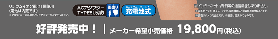 好評発売中!|メーカー希望小売価格19,800円(税込)|リチウムイオン電池1個使用(電池は内蔵です)※タカラトミー玩具専用ACアダプターをご使用ください。|ACアダプターTYPE5U対応(別売)|充電池式|※インターネット・Wi-Fi等の通信機能はありません。※写真やイラストはイメージです。実際の商品とは異なる場合があります。※画面はハメコミ合成です。※画面は開発中のものです。