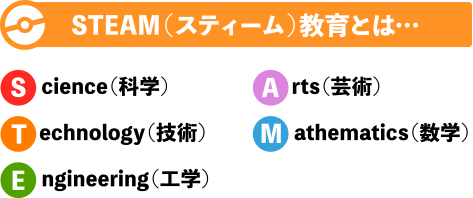 これらの頭文字を組み合わせたもので、理数系分野だけでなく芸術分野も重要視する教育方針です。これからの新しい社会の中で、現実問題を解決したり、今までにないものを創造するためにはプログラミング教育を中心にした「STEM(ステム)」に加えて、芸術的感性や対人コミュニケーション能力などを育んでいくことが大切と言われています。 まさに現代の子供だちがこれからを生き抜いていくために必要な教育として注目されているものです。