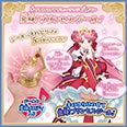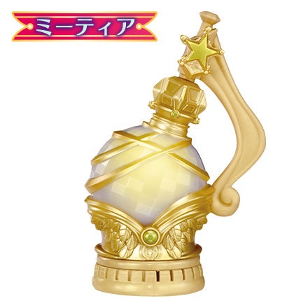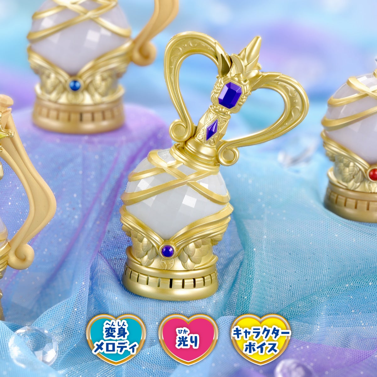 プリンセスたちが使う変身のためのアイテムです。振るとベルの音が鳴って光ります。手のひらにのせるとキャラクターのセリフのあと、変身メロディが流れ、最後に決めゼリフを聞くことができます