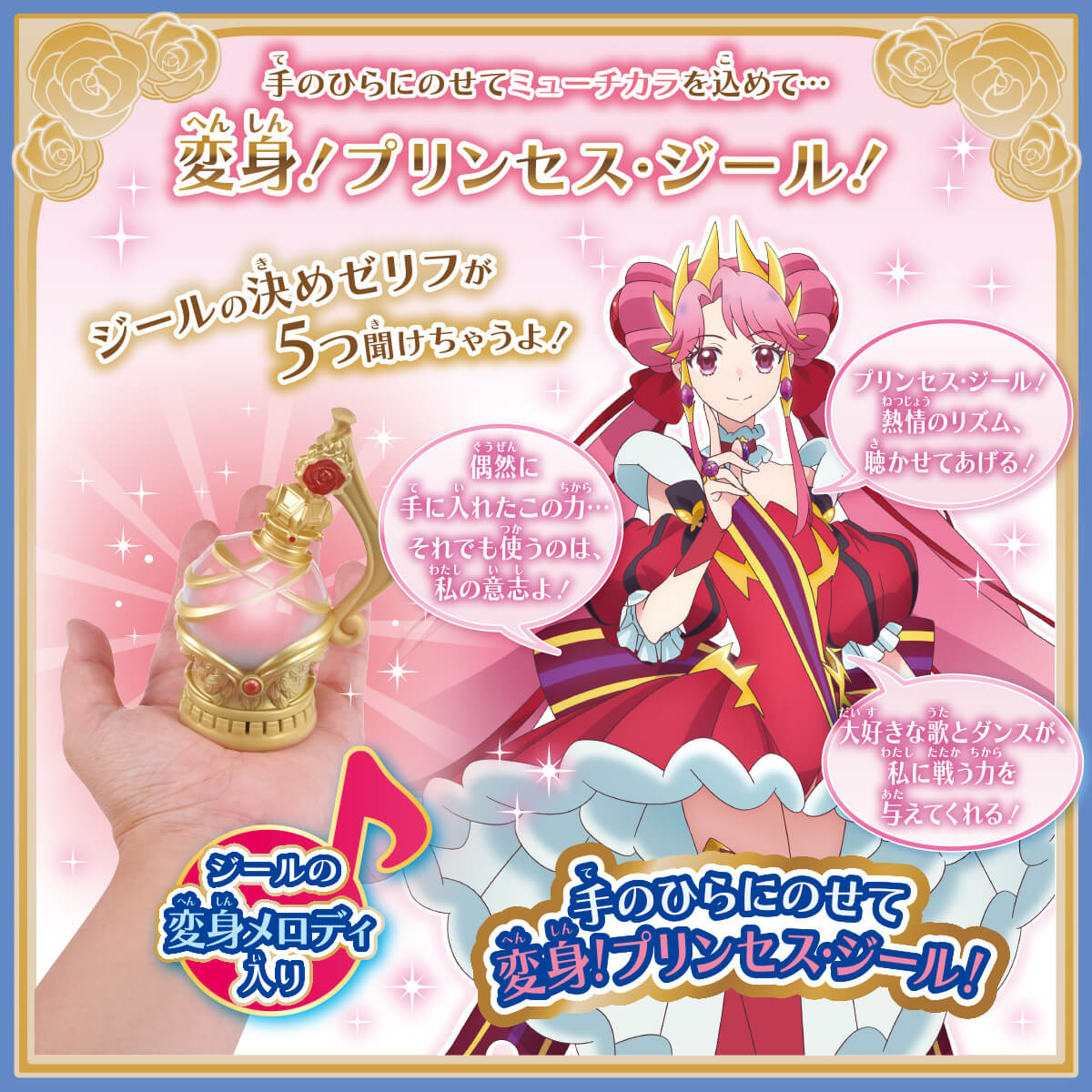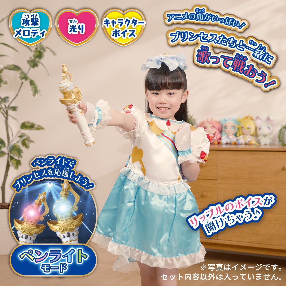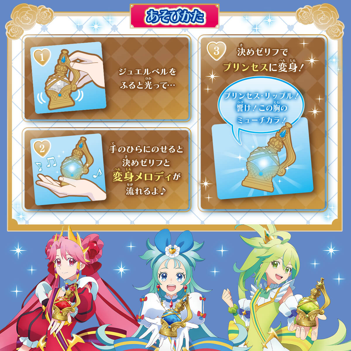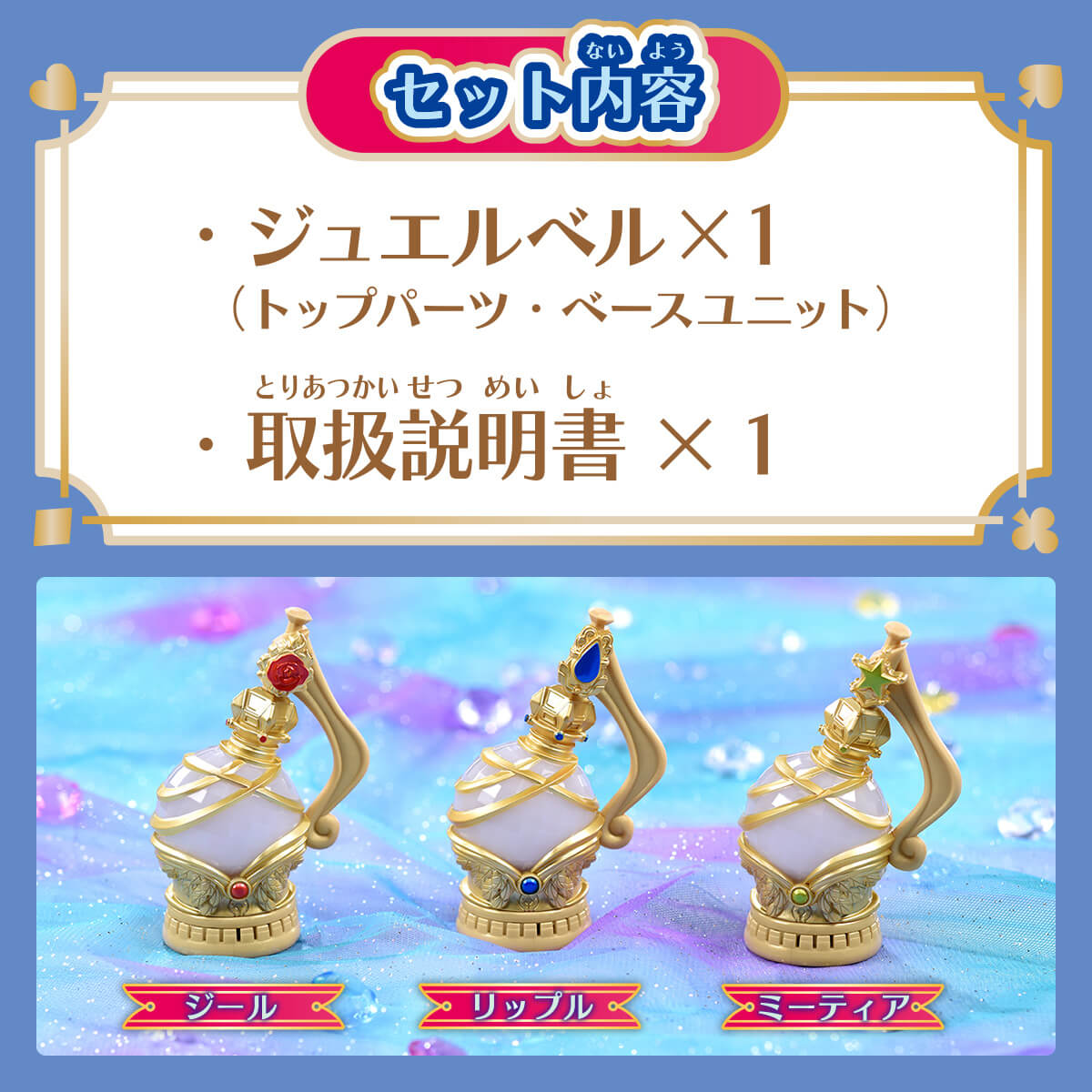 プリンセスたちが使う攻撃用アイテム。アニメの曲を5曲収録。オープニング、エンディング、キャラソンとセリフが楽しめるミュージックモード、アニメの曲と連動して光り方が変わるミュージックライトモード、好きな色を選んでプリンセスを応援するペンライトモード、そして、色で占い遊びができるカラー占いモードがあります。別売りのジール、ミーティアのジュエルベルに付け替えると、それぞれのキャラソンとセリフを聞くことができます。
