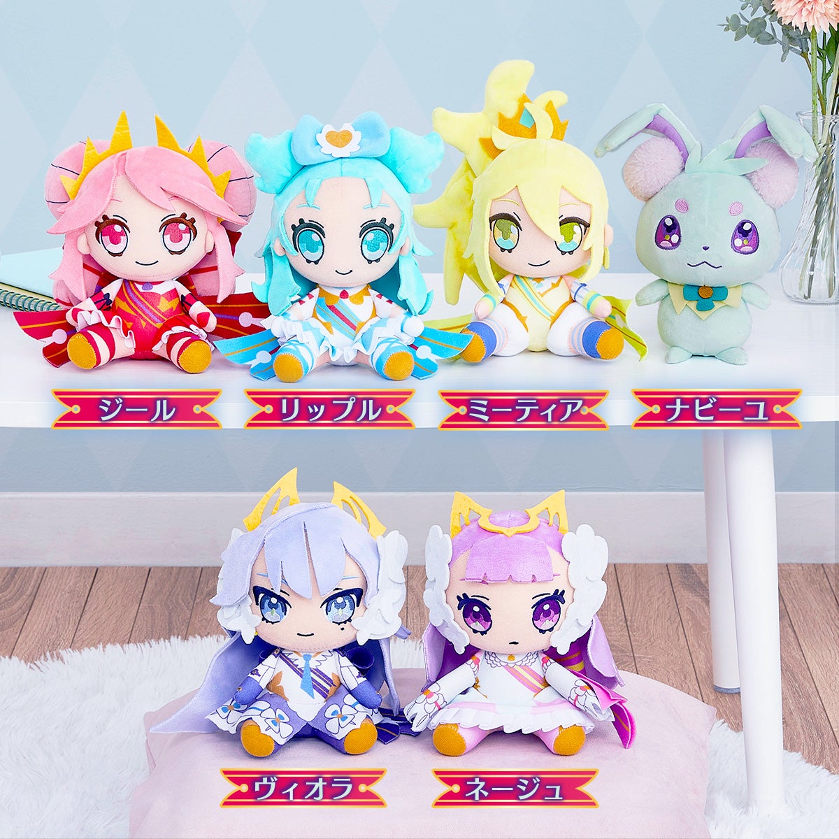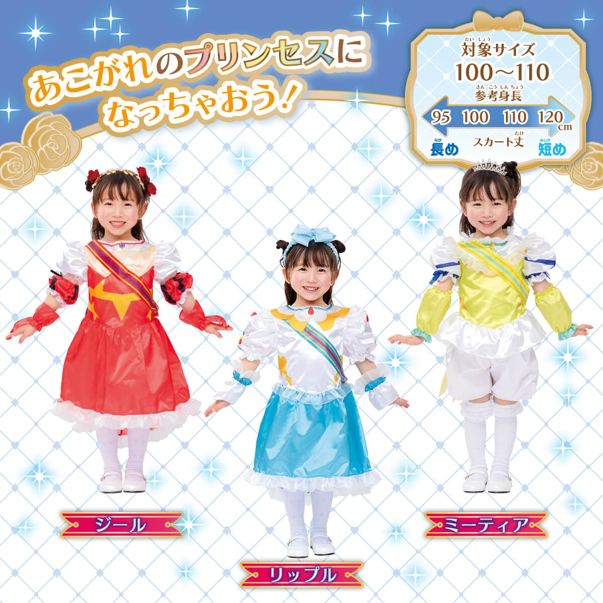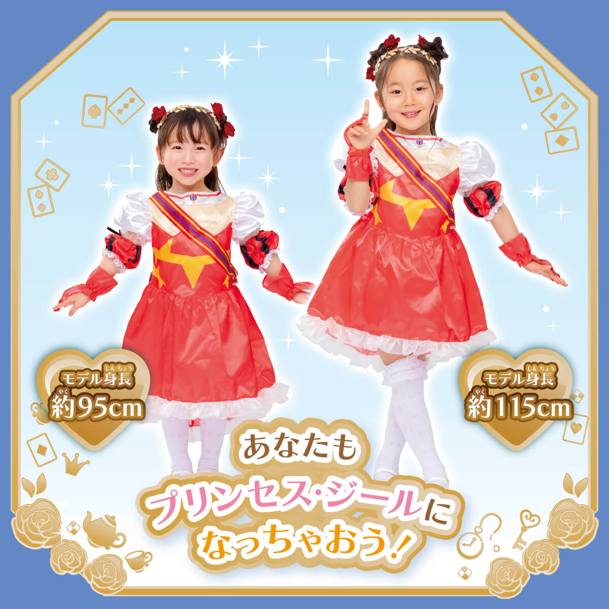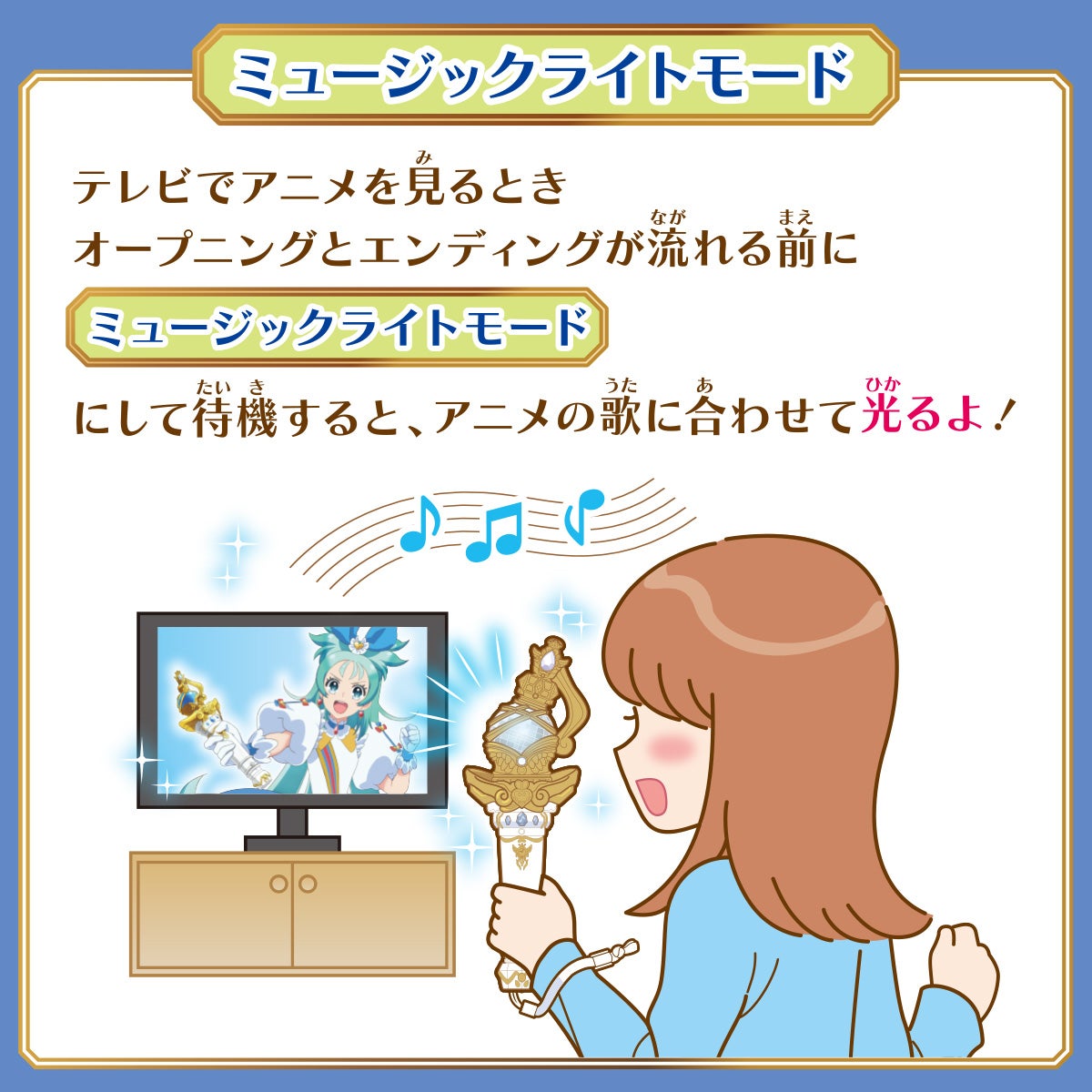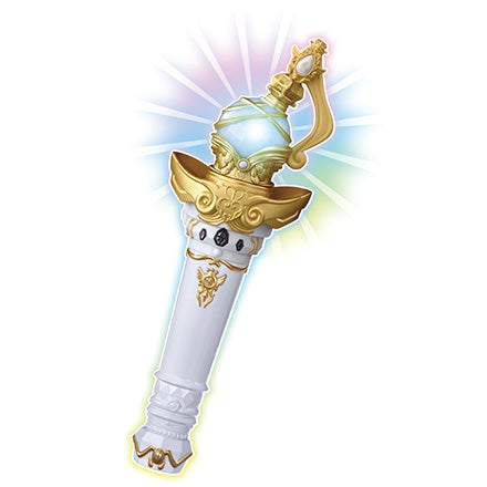 プリンセスたちが使う攻撃用アイテム。アニメの曲を5曲収録。オープニング、エンディング、キャラソンとセリフが楽しめるミュージックモード、アニメの曲と連動して光り方が変わるミュージックライトモード、好きな色を選んでプリンセスを応援するペンライトモード、そして、色で占い遊びができるカラー占いモードがあります。別売りのジール、ミーティアのジュエルベルに付け替えると、それぞれのキャラソンとセリフを聞くことができます。