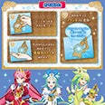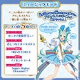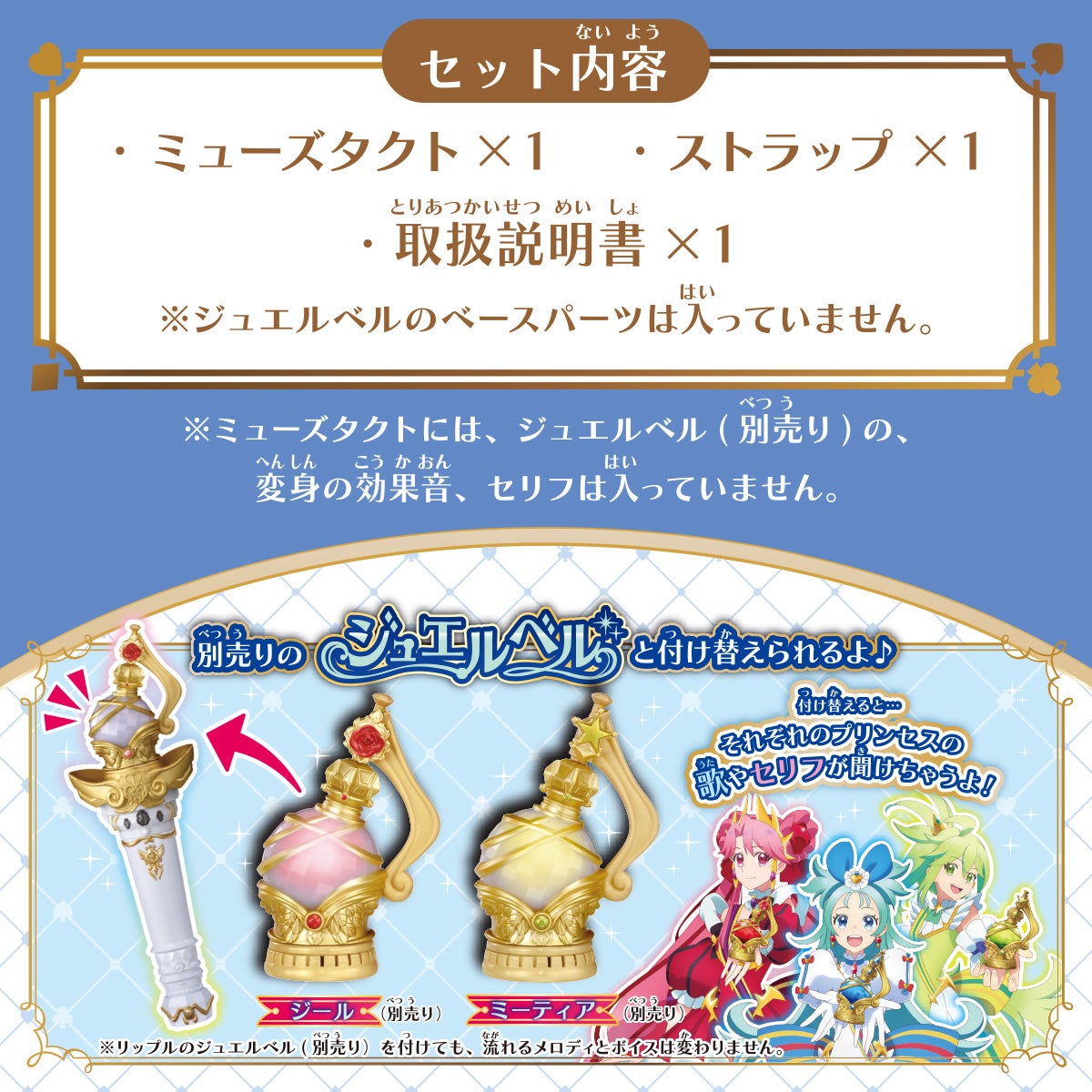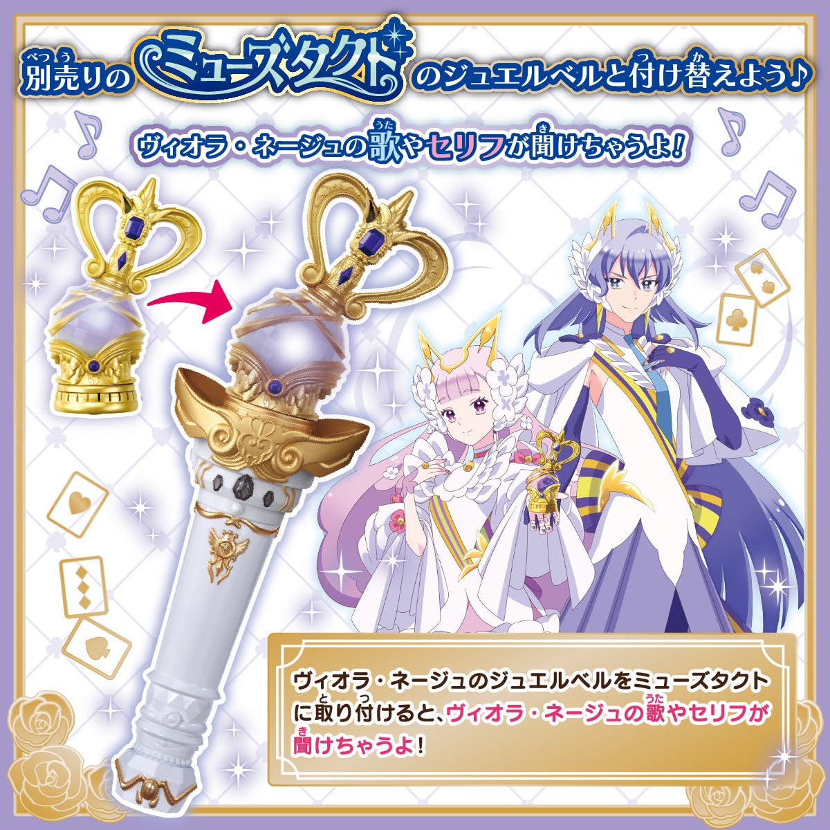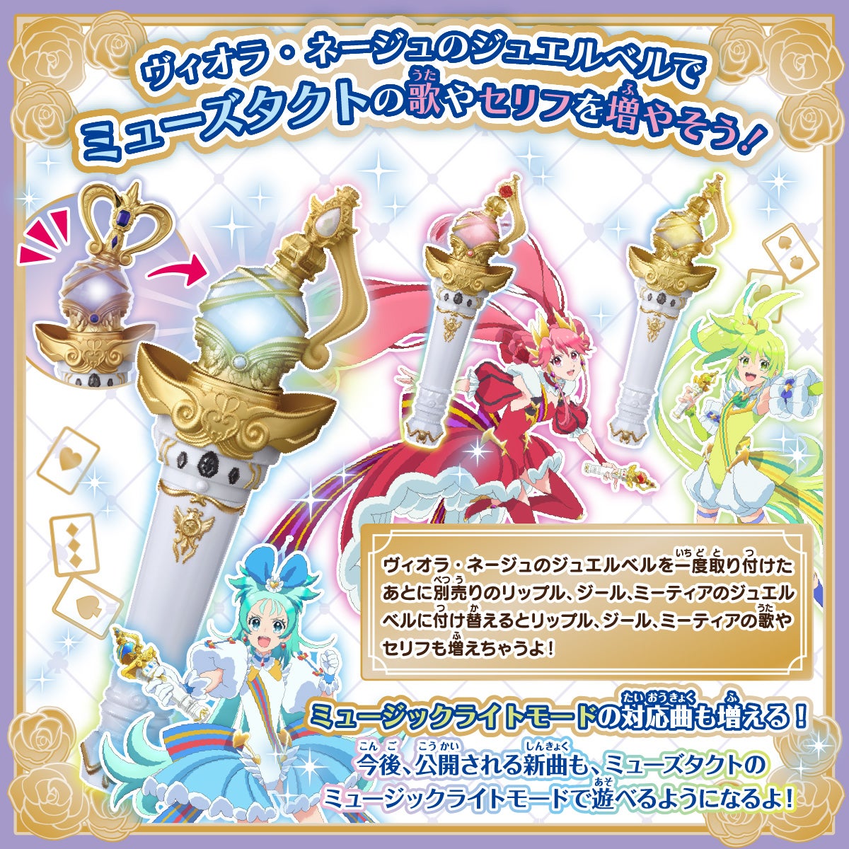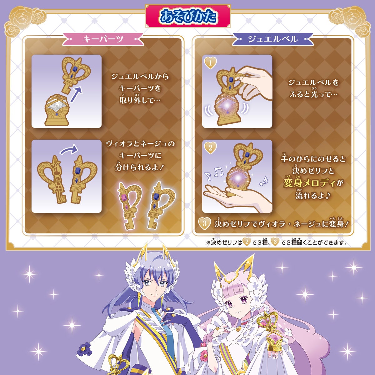 二人が持つカギを合わせて、差し込むとジュエルベルが完成します。振るとベルの音が鳴って光り、手のひらにのせるとキャラクターのセリフのあと、変身メロディが流れ、最後に決めゼリフを聞くことができます。また、別売りの攻撃アイテム、ミューズタクトに装着すると、ミューズタクトが追加で6曲解放。後期OPテーマ「FUTURE SESSION」、後期EDテーマ「ONENESS HARMONY」、ヴィオラ&ネージュの曲が聞けるほか、更にリップル、ジール、ミーティアのジュエルベルに付け替えることでそれぞれの新曲が聞けるようになり、合計13曲の楽曲が楽しめるようになります。