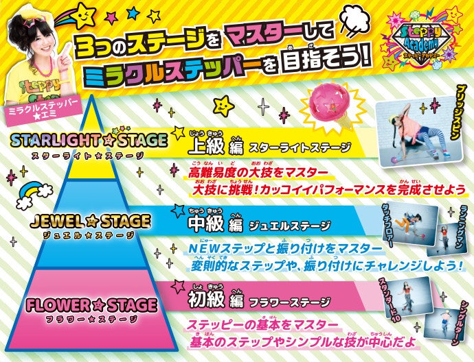 3つのステージをマスターしてミラクルステッパーを目指そう! 上級編 スターライトステージ高難易度の大技をマスター 大技に挑戦!カッコイイパフォーマンスを完成させよう 中級編	ジュエルステージ NEWステップと振り付けをマスター 変則的なステップや、振り付けにチャレンジしよう! 初級編 フラワーステージ ステッピーの基本をマスター 基本のステップやシンプルな技が中心だよ