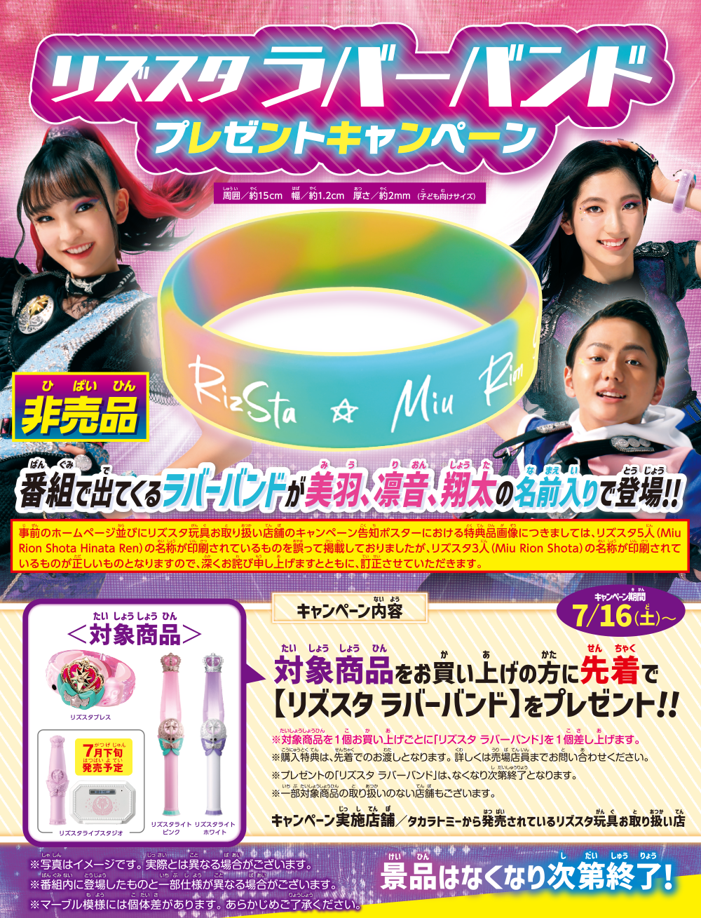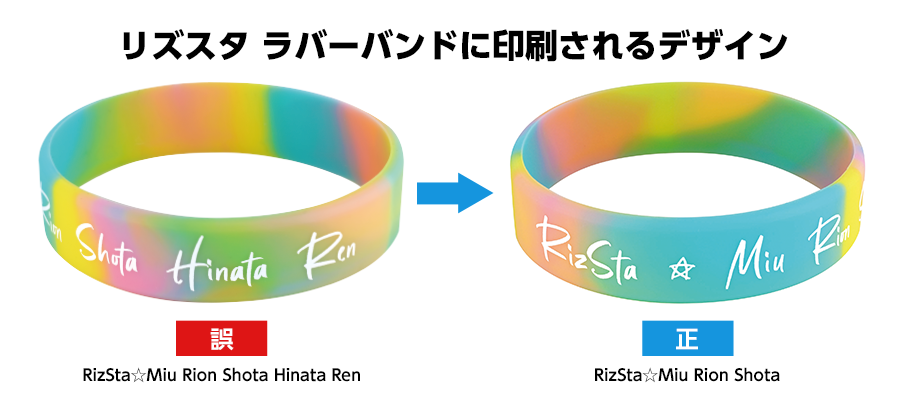 本特典品であるリズスタ ラバーバンドは、リズスタ3人(Miu Rion Shota)の名称が印刷されるのが正しいものでありましたが、事前の告知画像につきましてはリズスタ5人(Miu Rion Shota Hinata Ren)の名称が印刷されているものを誤って掲載しておりました。