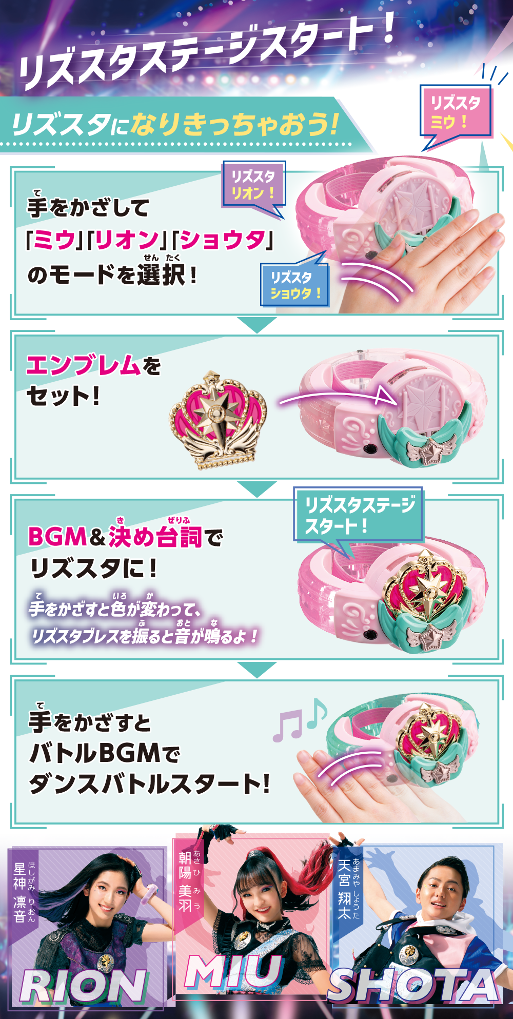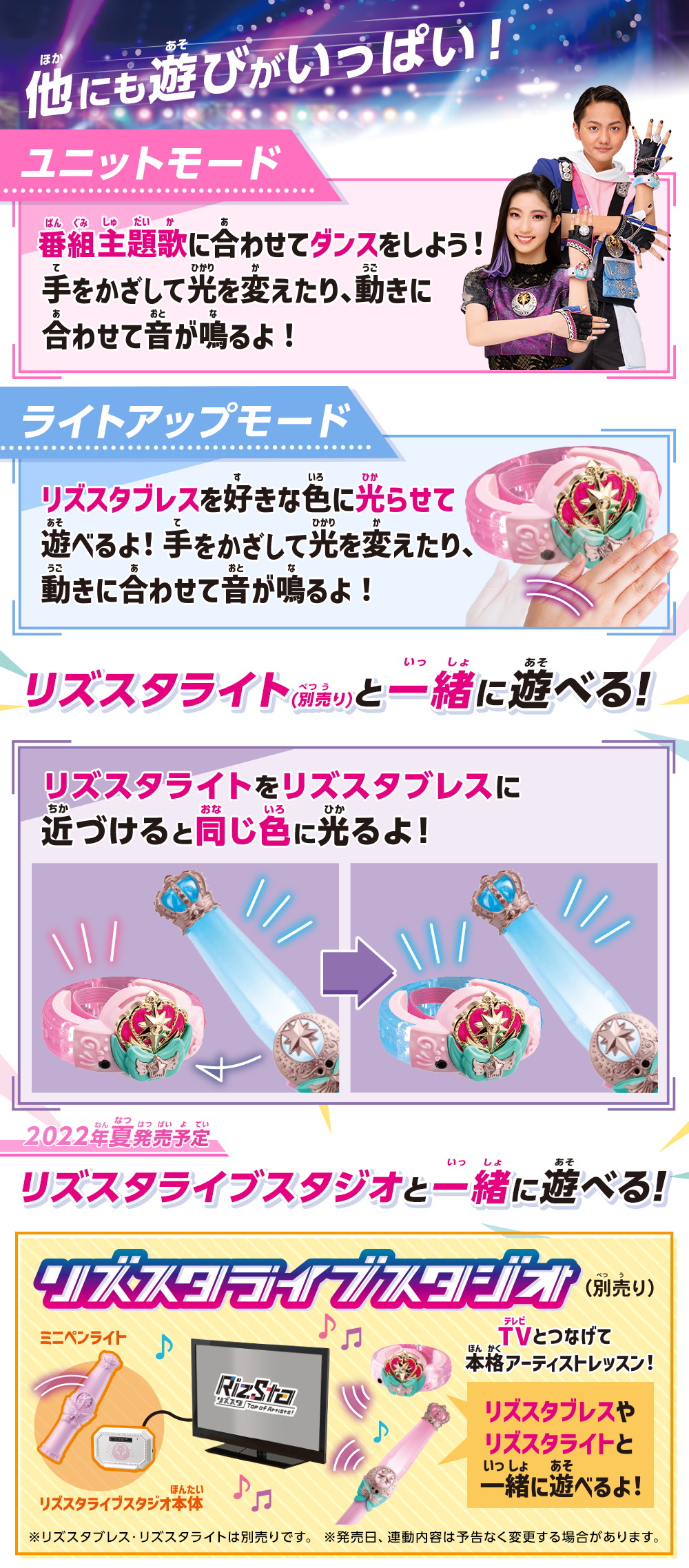 さらに「リズスタライト」(別売り)とも連動!「リズスタブレス」に「リズスタライト」を近づけると同じ色に光って楽しめる!リズスタエンブレム、スターエンブレム各1個つき。