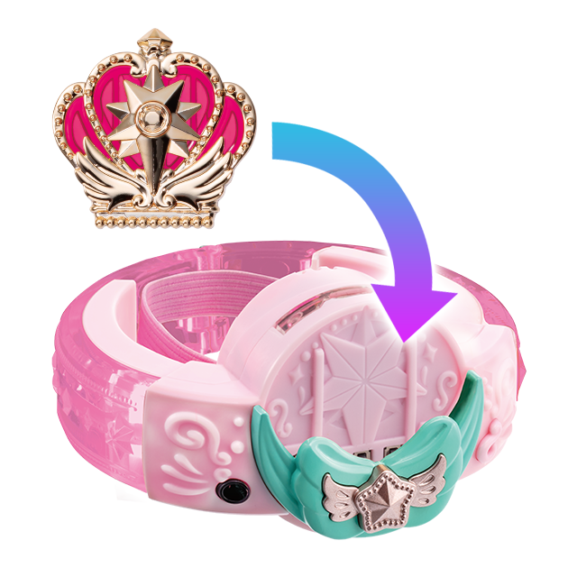 付属のリズスタエンブレムをセットすると、リズスタステージがスタート!美羽、凛音、翔太それぞれのダンスBGMやセリフが流れるよ!ダンスBGM中に「リズスタブレス」(本体左側のセンサー部分)に手をかざすと、「リズスタブレス」がカラフルに光り、色の変化を楽しめる!