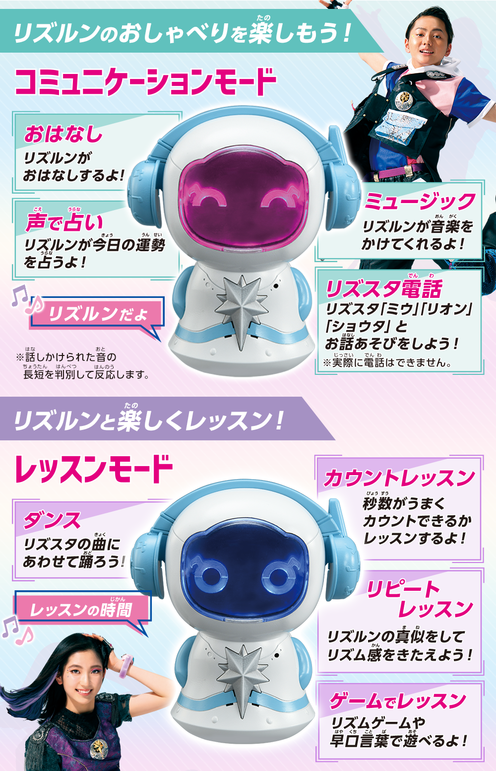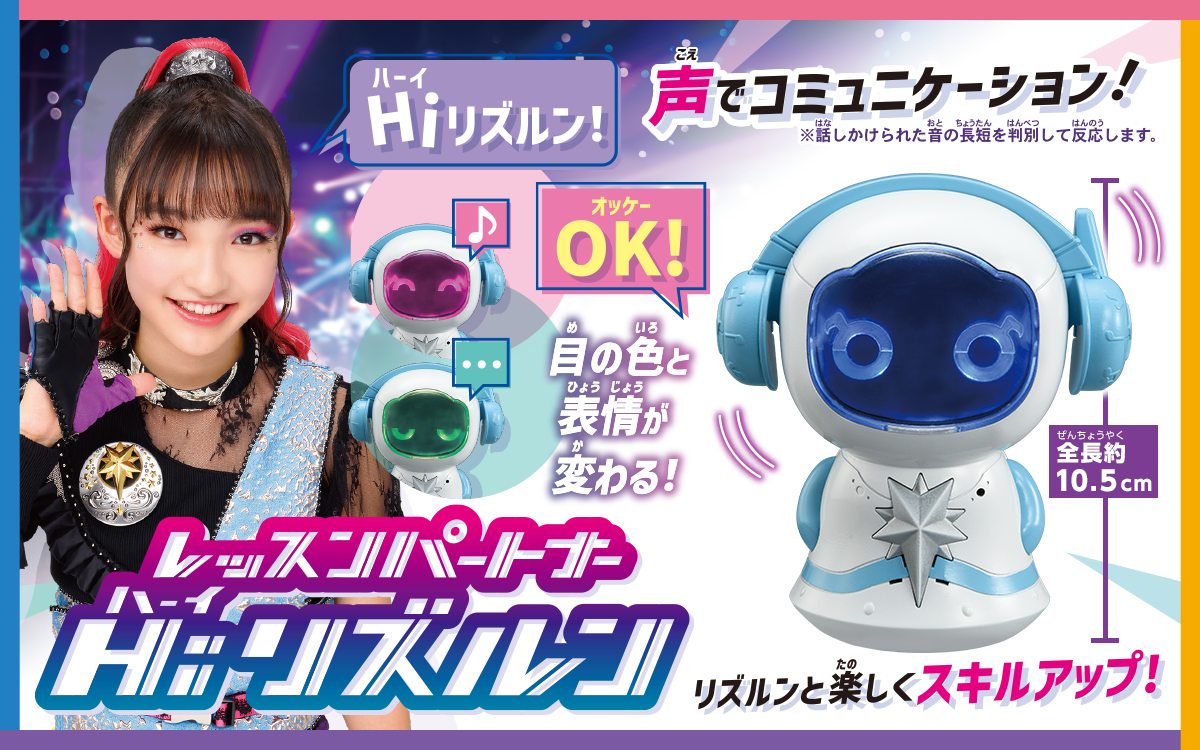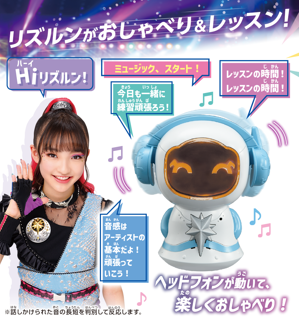 さらに話しかけると表情や目の色が変わったり、ヘッドホンがカタカタ動いたり感情表現をするよ!「コミュニケーションモード」では、リズルンとのお話や、リズスタメンバーとの電話遊び、占い等が楽しめる!「レッスンモード」ではダンスBGMを流したり、リズム遊びや歌遊びをしたり、アーティストレッスンができちゃう!