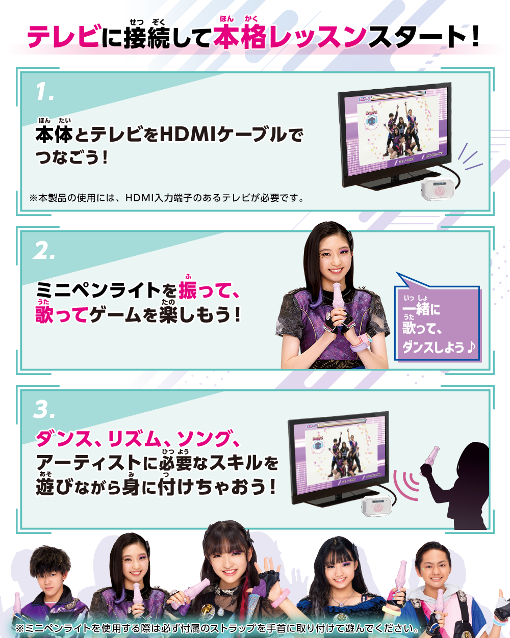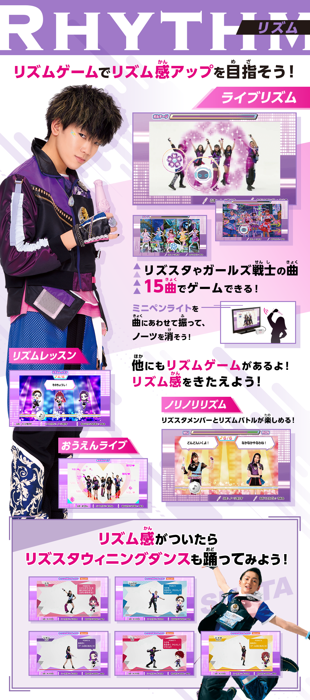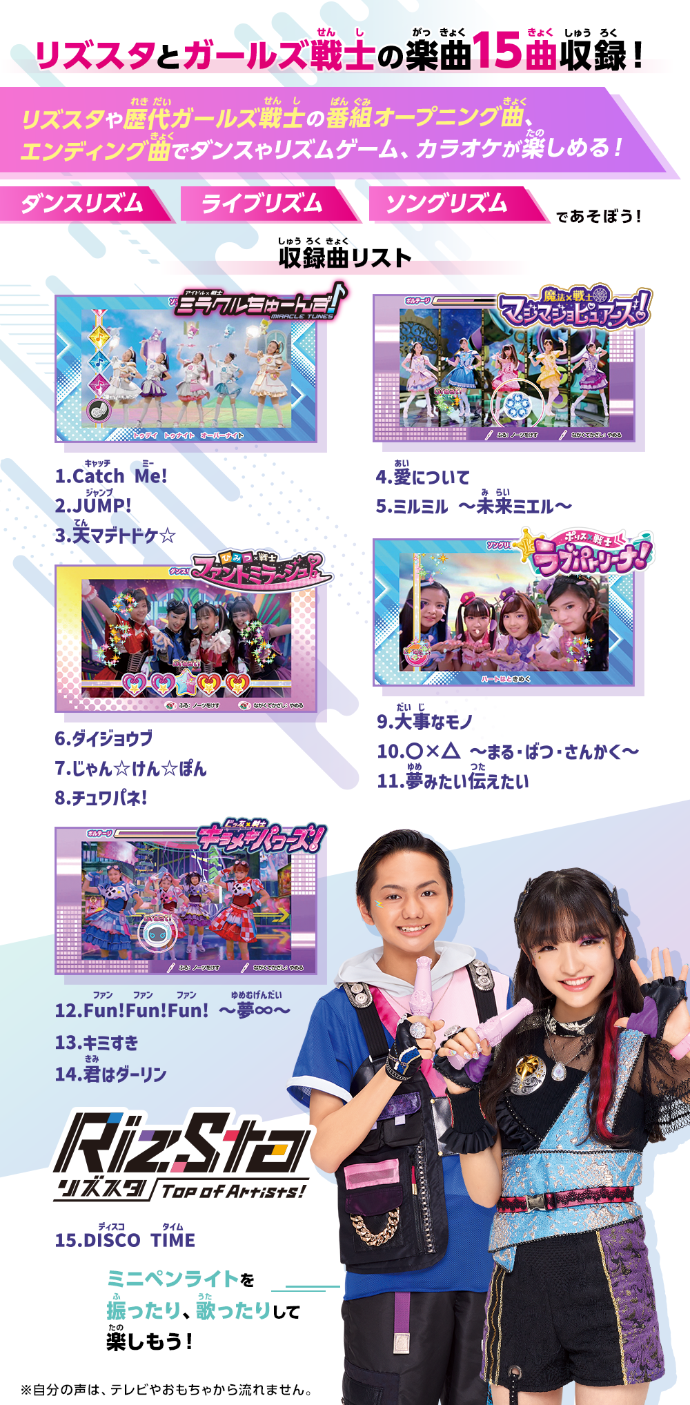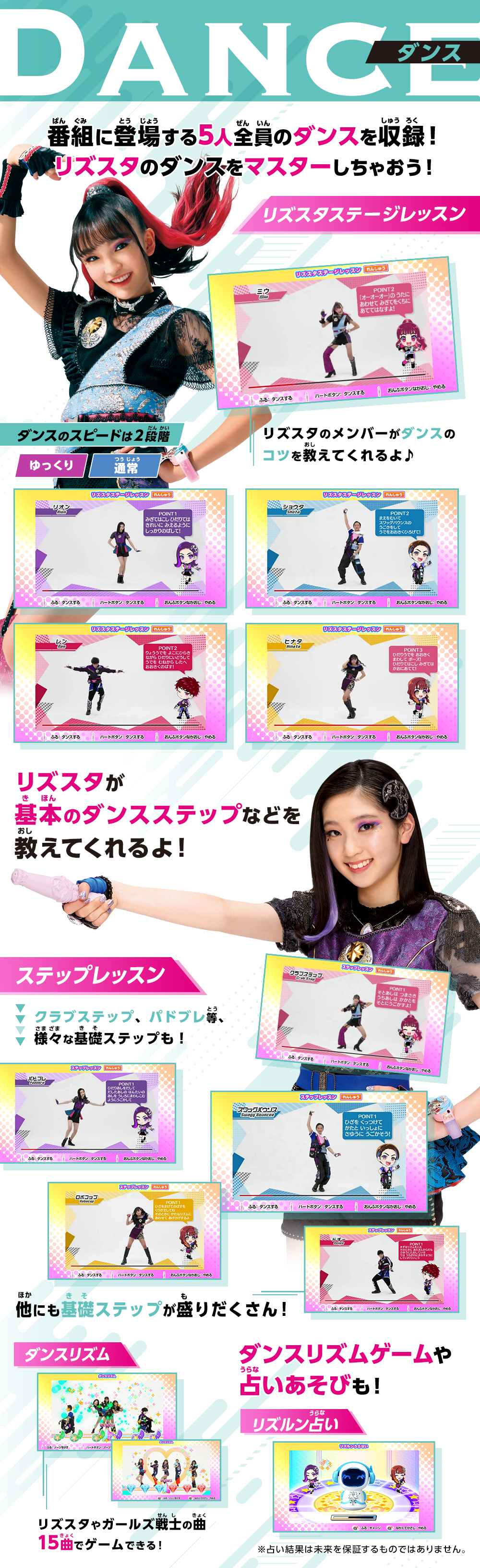 テレビに接続するだけでアーティストに必要な「ダンス」「リズム」「ソング」のスキルがゲーム感覚で楽しく身につく!「ダンス」モードではリズスタが基本のダンスステップや番組内に登場するダンスなどたくさんのダンスのコツを教えてくれるよ!「リズム」モードではリズムゲームでリズム感アップを目指そう!「ソング」モードではボイスレッスンやカラオケなどで歌唱力を磨こう!リズスタと歴代ガールズ戦士の楽曲が全15曲収録!付属のミニペンライトを振ったり、歌ったりしてダンスやリズムゲームや歌をいっぱい楽しんじゃおう!