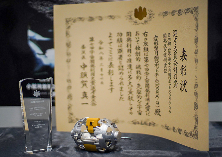 株式会社タカラトミー(代表取締役社長:富山彰夫 /所在地:東京都葛飾区)が、宇宙航空研究開発機構(理事長:山川宏)宇宙探査イノベーションハブ、ソニーグループ株式会社(代表執行役 社長 CEO:十時 裕樹)、同志社大学(学長 小原 克博)の4者で共同開発した変形型月面ロボット(Lunar Excursion Vehicle 2(LEV-2)、愛称「SORA-Q」、以下「LEV-2」)の開発及び技術検証について、内閣府の主催する第7回宇宙開発利用大賞のうち、独創的・挑戦的・先駆的な宇宙開発利用の推進に多大に貢献したものとして選考委員会特別賞を受賞し3月17日に表彰式が執り行われました。