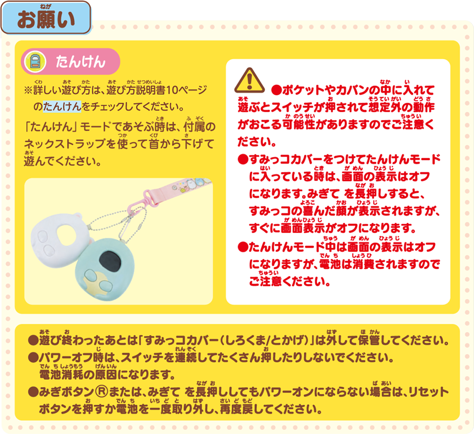 付属のしろくま・とかげのカバーを液晶本体につけると「フレンドモード」、カバーを外すと「ゲームモード」と2つのモードが楽しめます。「フレンドモード」で頭をなでたり・ゆらしたり・傾けたり、ふれあいアクションを行うと、すみっコが様々なリアクションをしてくれます。