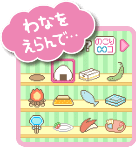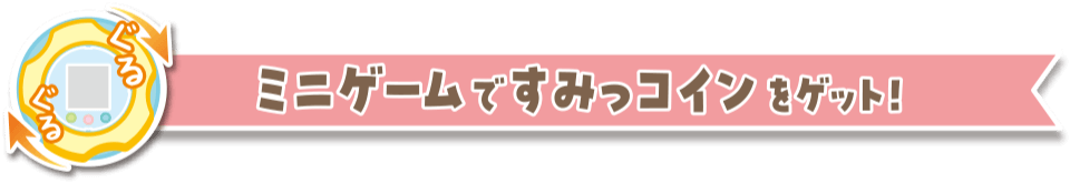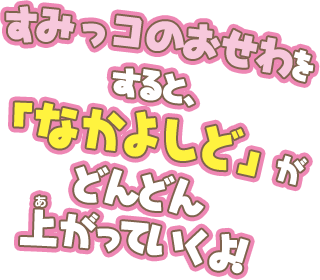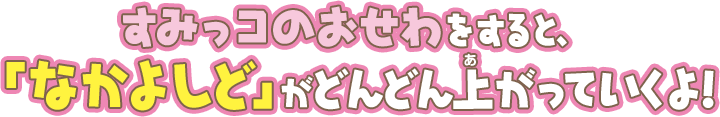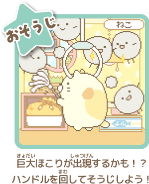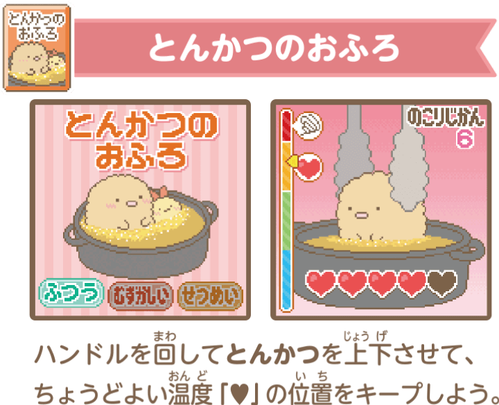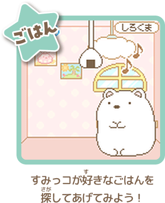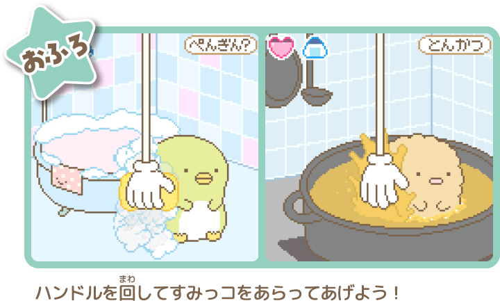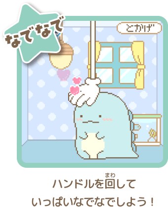 ごはんをあげたり、なでなで、そうじ、おふろなど、すみっコと触れ合うほど「なかよしど」がアップするよ。 - ハンドルを回してゲーム!