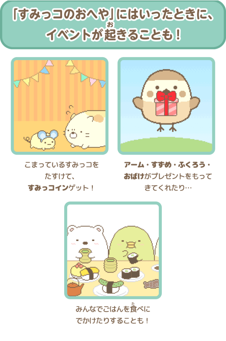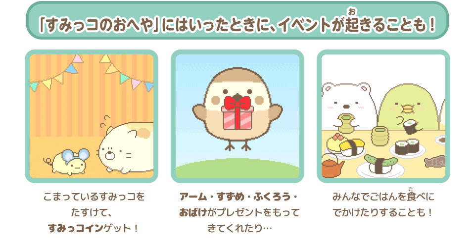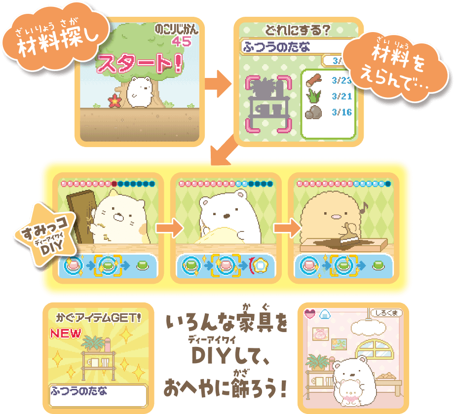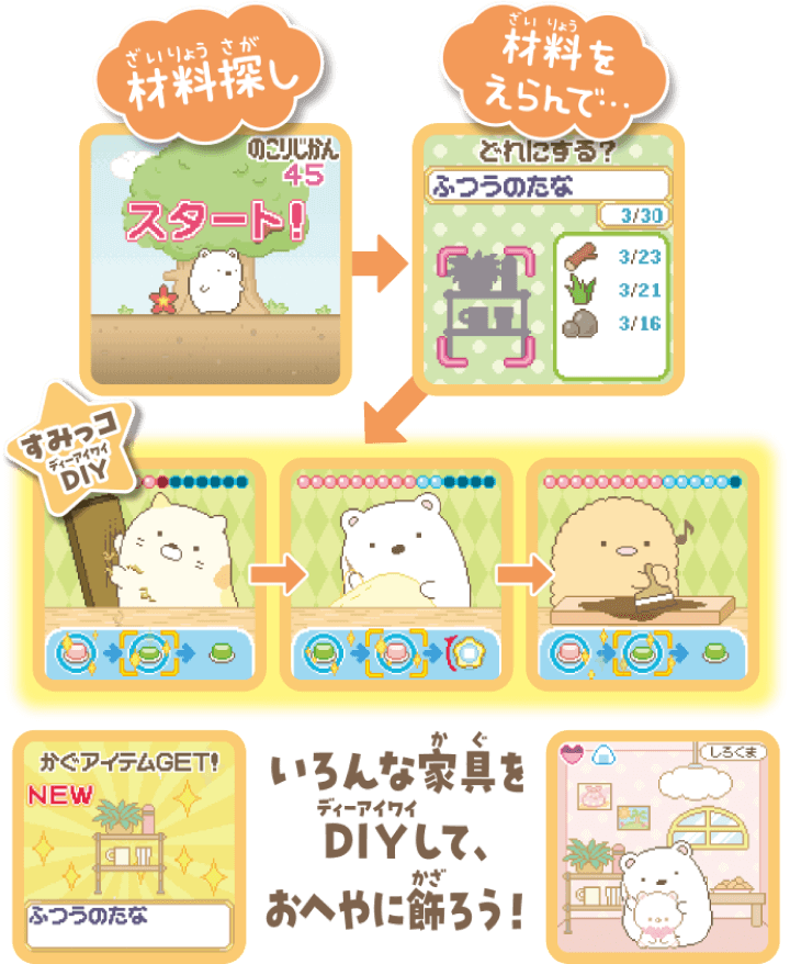 コインをあつめてガチャを回したり、わなやアイテムを使って、たくさんのすみっコたちをあつめよう! - 材料をあつめて家具をつくるすみっコDIYもできるよ。できた家具はおへやに飾ろう!