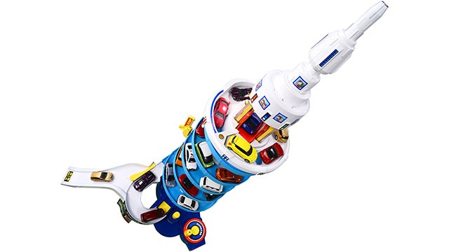 スクランブル発車モードに変形すると中央コアに格納したトミカが一斉出動します。