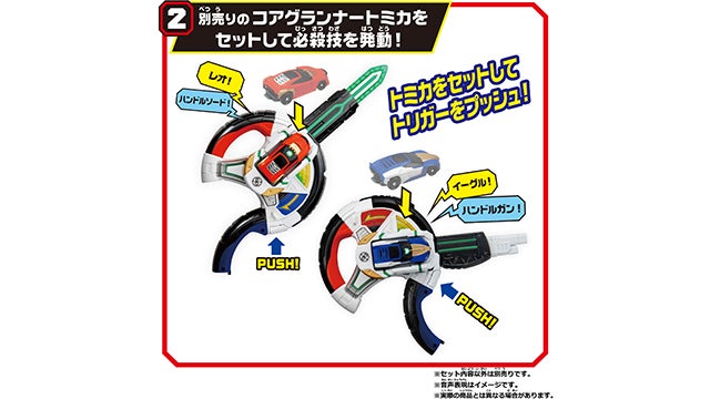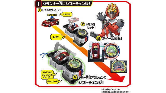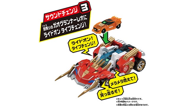 ・シフトチェンジ後、コアグランナーレオトミカをセットした状態でホイール回転およびレバーの前後アクションすると光やサウンドとともにアースグランナーの必殺技サウンドが発動!