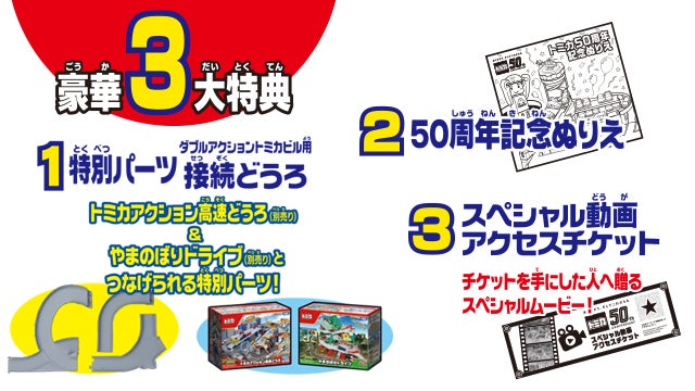 2020年生誕50周年を迎える「トミカ」の歴史を振り返り、トミカが誕生した1970年から10年毎の歴史と共に、その年毎に「今でも印象が強い車」のトミカがセットになった商品です。