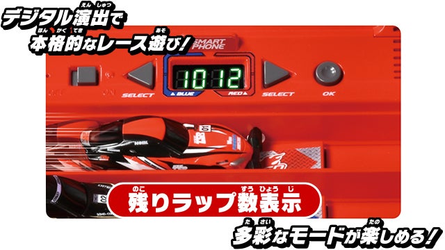 デジタルカウンター搭載で勝敗判定が可能。さらに実況サウンドでレースバトルを盛り上げるぞ!