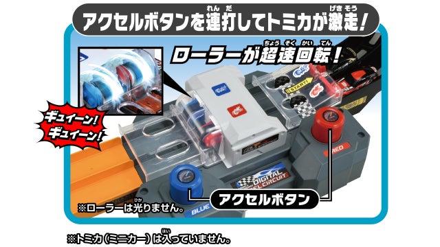 別売りのスーパースピードトミカを認証させると車両ごとの専用サウンドでレースを実況します。