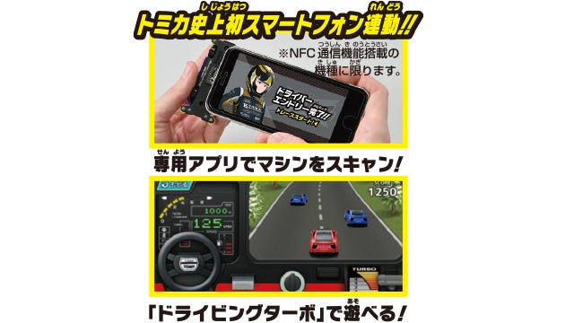 本体に内蔵されたNFCチップを別売りの「デジタルアクセルサーキット」商品に認証させると専用サウンドや演出が楽しめます。遊ぶごとに経験値を獲得。専用アプリのドライバーレベルをアップさせてアプリ内ゲームで遊ぶことが出来ます。
