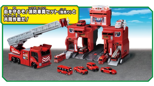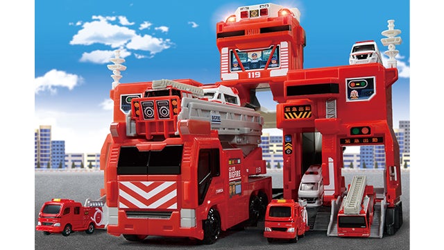 サウンド満載でトミカの出動遊びが楽しい消防署「コマンドステーション」とトミカ積載可能な大きなはしご消防車「ビッグファイヤー」のセットです。