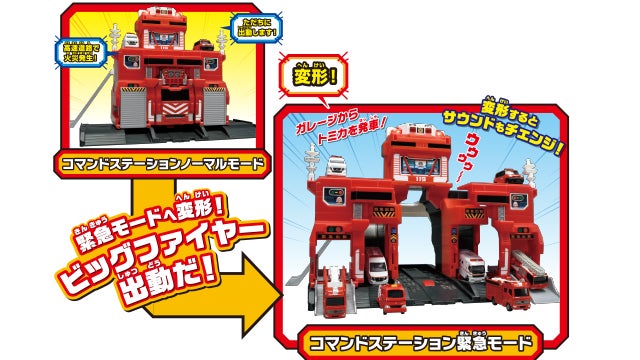 巨大な消防署がボタン一つで驚きの変形!トミカを載せてビッグファイヤーが出動だ!