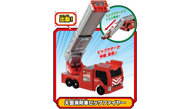 ビッグファイヤーには2台のトミカが積載可能。ラダーを伸ばせばスロープ出動が出来ます。ビッグラダーは伸縮、旋回が可能です。